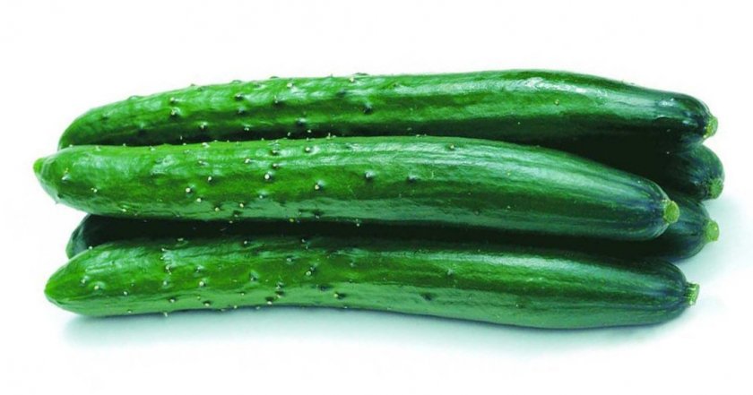 Огурчики имеют удлиненную, цилиндрическую форму, могут быть значительно сужены в области плодоножки. Длина зеленцов – 35-40 см, вес – 280-310 г. Окрас темно-зеленый, насыщенный. На шкурке имеются видимые, довольно крупные бугорки, на которых располагаются колючки. Кожура блестящая, тонкая, не горчит и легко съедается. Мякоть плотная, хрустящая. Семена небольшие, длинные, во время еды практически не ощущаются.