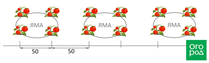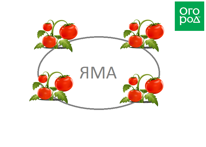 Главный же секрет опытных огородников заключается в необычной посадке помидоров. Растения высаживаются по углам воображаемого квадрата, в центре которого располагается поливная яма. На одну яму приходится четыре куста помидоров.