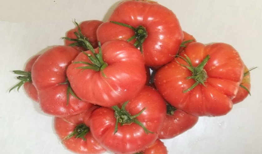 Томаты среднего срока созревания, сердцевидной формы, розовые с лёгкой ребристостью. Вес плода в пределах 300-400 г, некоторые до 500 г.