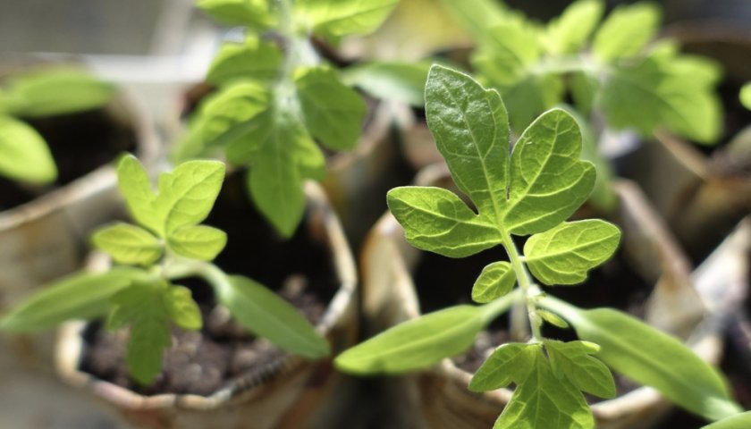 - После формирования двух полноценных листочков томатные саженцы пересаживают по отдельным контейнерам.