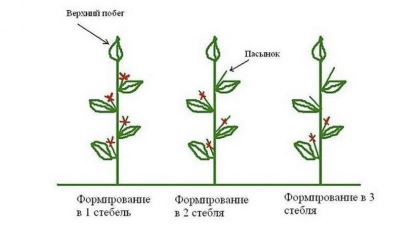 Подвязывают томатные кусты по мере роста, на протяжении всего сезона;- Формирование куста осуществляют в 2-3 стебля, удаляя все лишние пасынки.