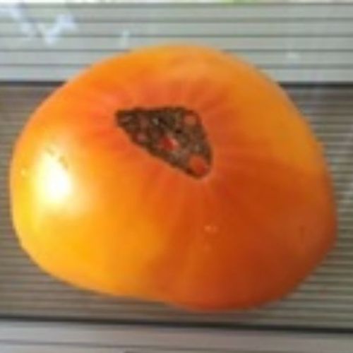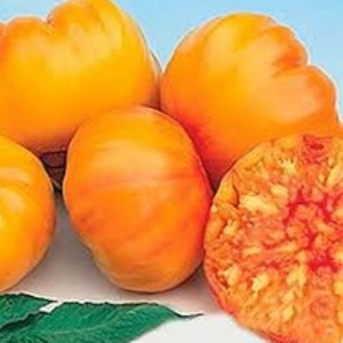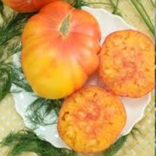 Очень красивый индетерминантный, среднеспелый сорт .Первые плоды созревают на 115-125 день после первых всходов. Сорт для тепличного выращивания высотой 1.8-2.0 м. Плоды плоскоокруглой формы золотисто-желтого цвета массой 350-450 г. На разрезе желтого цвета с малиновыми вкраплениями. Мякоть сахаристая, сочная , изумительно вкусная, сладкая. Плоды очень хороши для свежего потребления и соков. Фрмируют в 1-2 ствола. При хорошей агротехнике дает суперурожай.