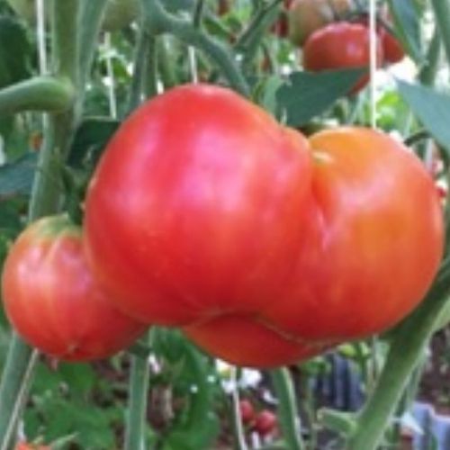Очень урожайный сорт от Жана Клода Бошера ( Франция). Индетерминантный, среднеспелый , высотой 1.5 м. Растение малооблиственное, с тонкими стеблями . В кисти завязывается 4-6 серцевидных плодов изящной формы с ребристыми плечиками массой 200 – 350 г, очень красивого оранжево-красного цвета. Мякоть плотная, мясистая , сладкая, ароматная, оранжевая с красными разводами. Сорт салатного назначения. Обладает хорошей завязываемостью и лежкостью. Формируют в 2 ствола.