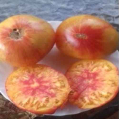 Индетерминантное, высокорослое растение , среднераннего срока созревания.Сорт би-колор. Крупные красно-оранжевые плоды с четкими желтыми полосами типа бифштекс, весом 300-580 г. Очень красивая окраска . Мякоть на срезе поражает красотой красок, вкусом и сладостью. Очень вкусный салатный сорт! Обладает повышенной устойчивостью к фитофторозу и длительным плодоношением. Растение формируют в один ствол. Любит солнечое место.